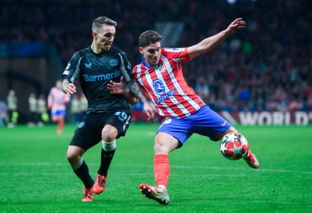 马竞本轮2比1击败勒沃库森队,掌握直接晋级16强的主动权。这是阿根廷前锋阿尔瓦雷斯(右)在比赛中射门。图片