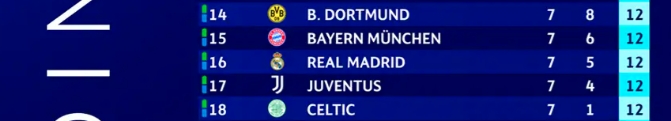 积分榜上,多特、拜仁、皇马、尤文和苏超凯尔特人队同积12分。